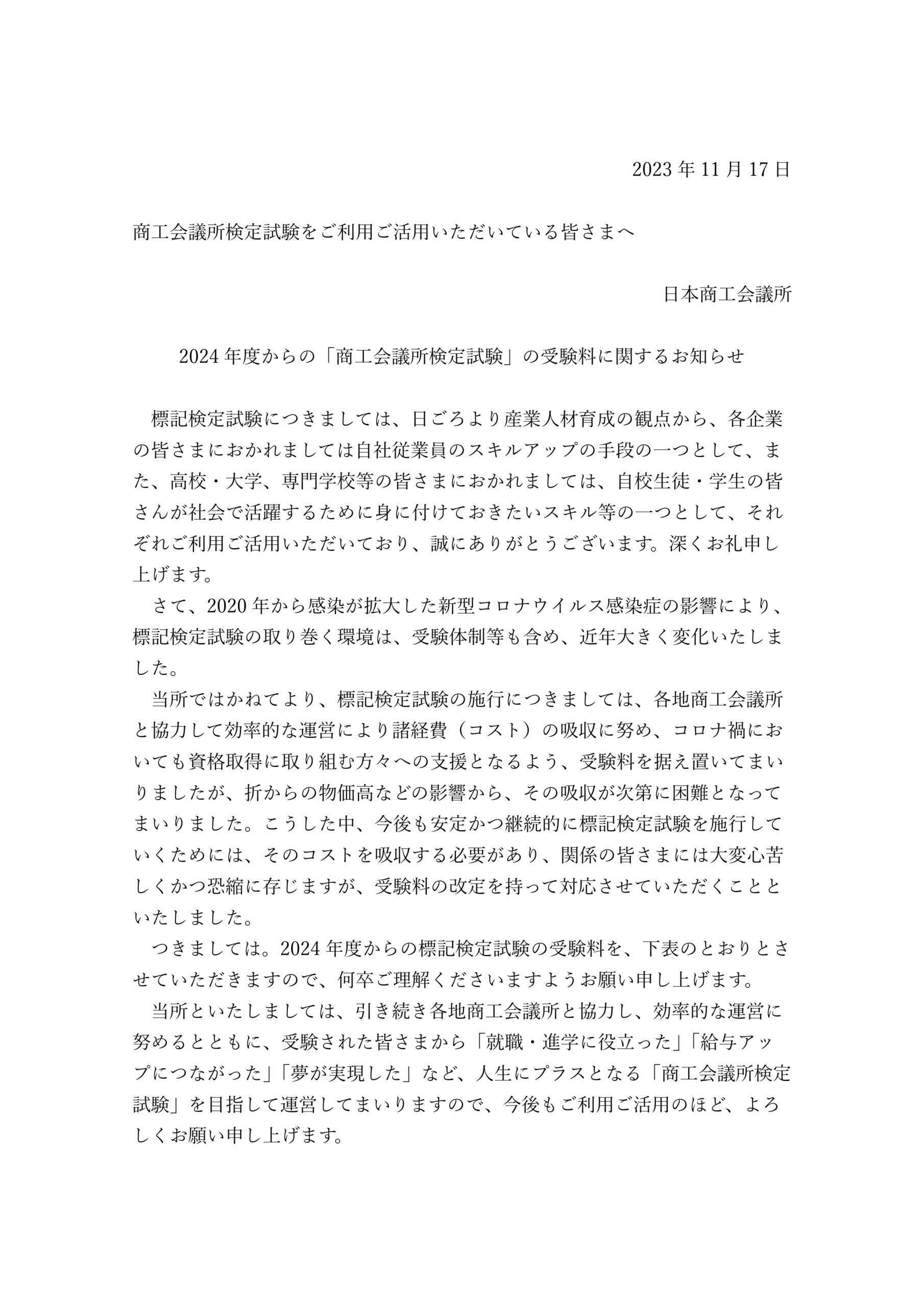 今般、日本商工会議所にて、諸般の事情により、2024年度から各種検定試験の受験料を改定することが発表されましたので、お知らせ申し上げます。